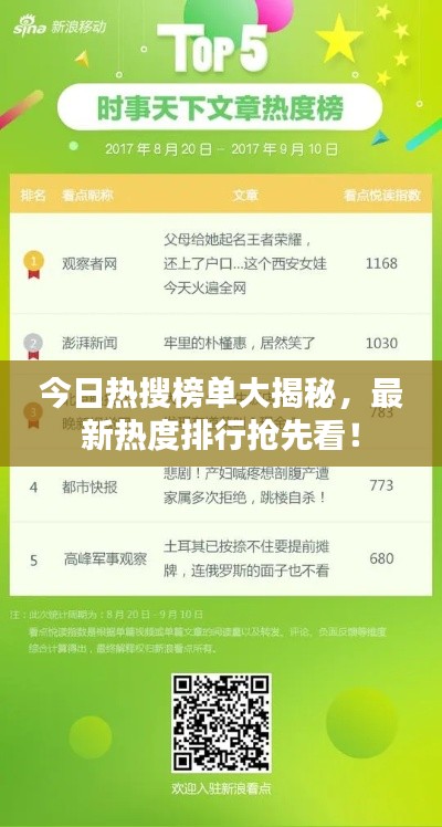 随着互联网的普及和社交媒体的飞速发展,越来越多的人关注各种话题的热度排行,我们将为您带来最新的热度排行榜单,让您了解当前最热门的话题、事件、人物等。