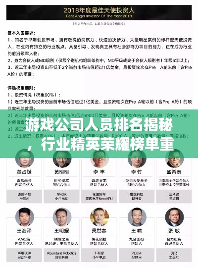 随着游戏产业的飞速发展,游戏公司人员排名逐渐受到广泛关注,这些排名不仅反映了游戏从业人员在游戏开发、运营、市场营销等方面的专业能力,也体现了他们在推动行业发展中的贡献,本文将为您详细介绍游戏公司人员排名,带您走进这个充满荣耀与挑战的精英圈子。