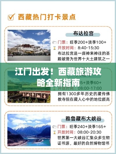 从江门出发前往西藏旅游,需要做好充分的准备,包括了解行程、准备物品、调整身体状态等,在游览过程中,请尊重当地文化,遵守旅游规定,希望这份最新的旅游攻略能帮助你顺利开启西藏之旅,祝愿你在美丽的西藏留下难忘的回忆。