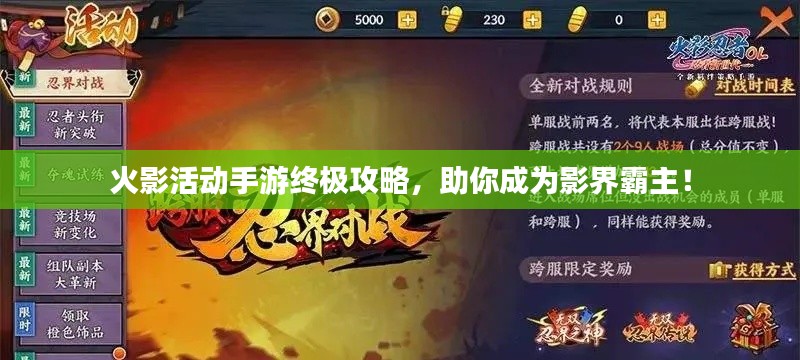 随着科技的进步和移动互联网的普及,手游已成为大众娱乐生活的重要组成部分。"火影活动手游"以其独特的剧情、丰富的角色和策略性的战斗,吸引了大量火影迷和手游爱好者的关注,本文将为大家带来“火影活动手游”的最新攻略,帮助玩家更好地掌握游戏,提升游戏体验。