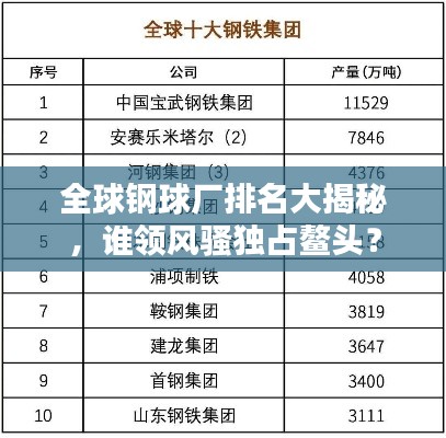 转载请注明来自安防监控安装,本文标题:《全球钢球厂排名大揭秘,谁领风骚独占鳌头?》