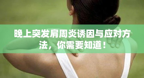 晚上突发肩周炎的原因多种多样,包括睡眠姿势不当、受凉、劳累过度等,了解这些原因后,我们可以采取相应的应对措施,如改善睡眠姿势、注意保暖、热敷缓解、药物治疗等,我们还应注意预防肩周炎的发生,保持正确姿势、劳逸结合、加强锻炼等,希望通过这篇文章,大家能对晚上突发肩周炎的原因及应对措施有更深入的了解。