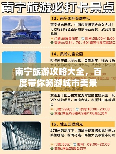 南宁这座美丽的城市拥有众多独特的旅游景点,从山水秀美的青秀山到宁静的南湖公园,从展示民族文化的博物馆到充满科技魅力的科技馆,从奇妙的动物园到茶文化氛围浓厚的金花茶公园,每一个景点都让人流连忘返,通过百度搜索,你可以轻松找到这些景点的详细信息,为你的南宁之行提供有力的帮助,希望你在南宁的旅行中,能够感受到这座城市的美丽与魅力。