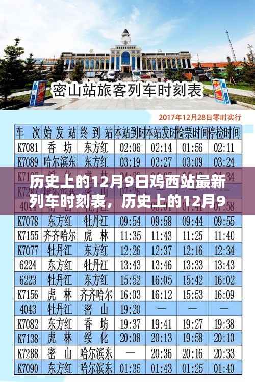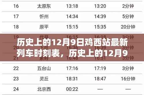 鸡西站作为黑龙江省的重要铁路枢纽,其列车时刻表的变动一直备受关注,本文将聚焦于历史上的12月9日鸡西站最新列车时刻表,带您一探其背后的故事与发展,通过回顾这一天的列车时刻表,我们可以更深入地了解鸡西站的发展历程,以及铁路交通对于地方经济、文化等方面的重要影响。