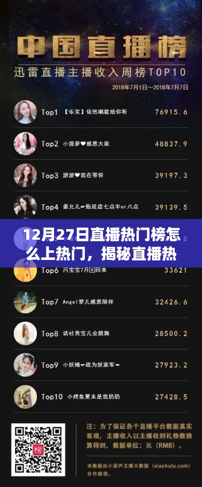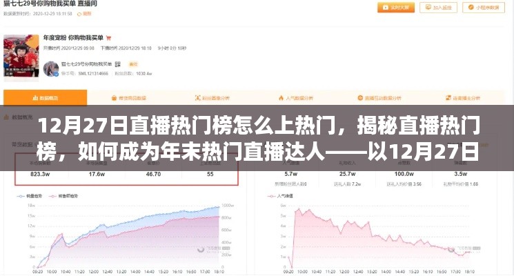 随着互联网的普及和直播行业的飞速发展,越来越多的人加入到直播的行列中,希望通过直播展示自己的才华和魅力,特别是在年末的特殊时期,各大平台都在举办各类活动,直播热门榜的竞争愈发激烈,如何在这样一个背景下成功吸引观众,成为直播热门榜上的佼佼者呢?本文将结合实际情况,以即将到来的12月27日为例,为大家分享一些实用的建议。