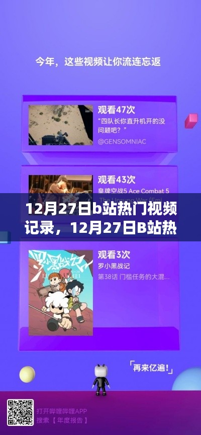 随着互联网的普及和社交媒体的飞速发展,B站(哔哩哔哩)已经成为广大网友获取热门视频内容的重要平台,在12月27日这一天,B站上的热门视频呈现出多样化、高质量的特点,吸引了无数网友的关注和热议,本文将带你回顾12月27日B站的热门视频,探寻潮流前沿与精彩瞬间。