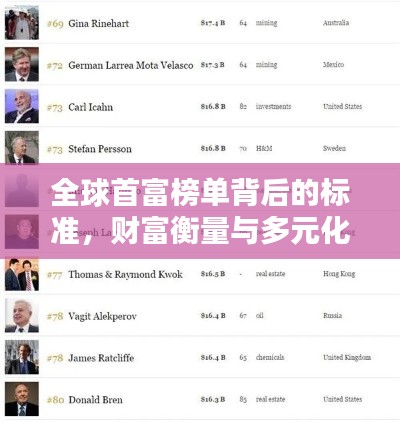 随着全球经济的发展,财富的积累与分配日益成为人们关注的焦点,世界首富的排名标准更是备受瞩目,它不仅反映了全球经济的动态变化,也揭示了财富创造与管理的多元化趋势,本文将探讨世界首富排名标准的相关内容,从多个角度审视财富衡量与评估的多元化指标。